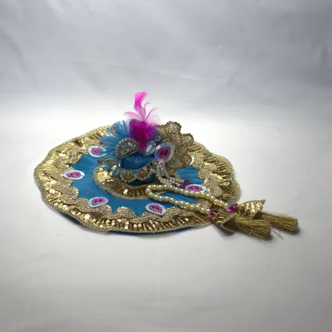 Mukut features golden lace, pearl and mirror butties, white and pink tassels, and a vivid pink feather for a royal look.