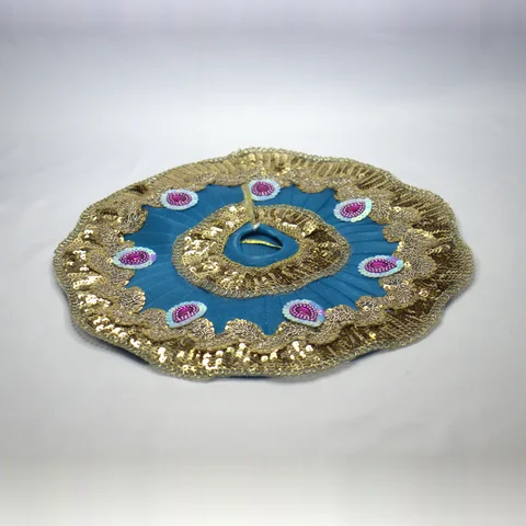 The first thing you notice is the color. A rich royal blue net that catches the light differently depending on where your Thakurji sits. Against this blue base, the golden lace trim and sequin embellishments create warmth and depth.