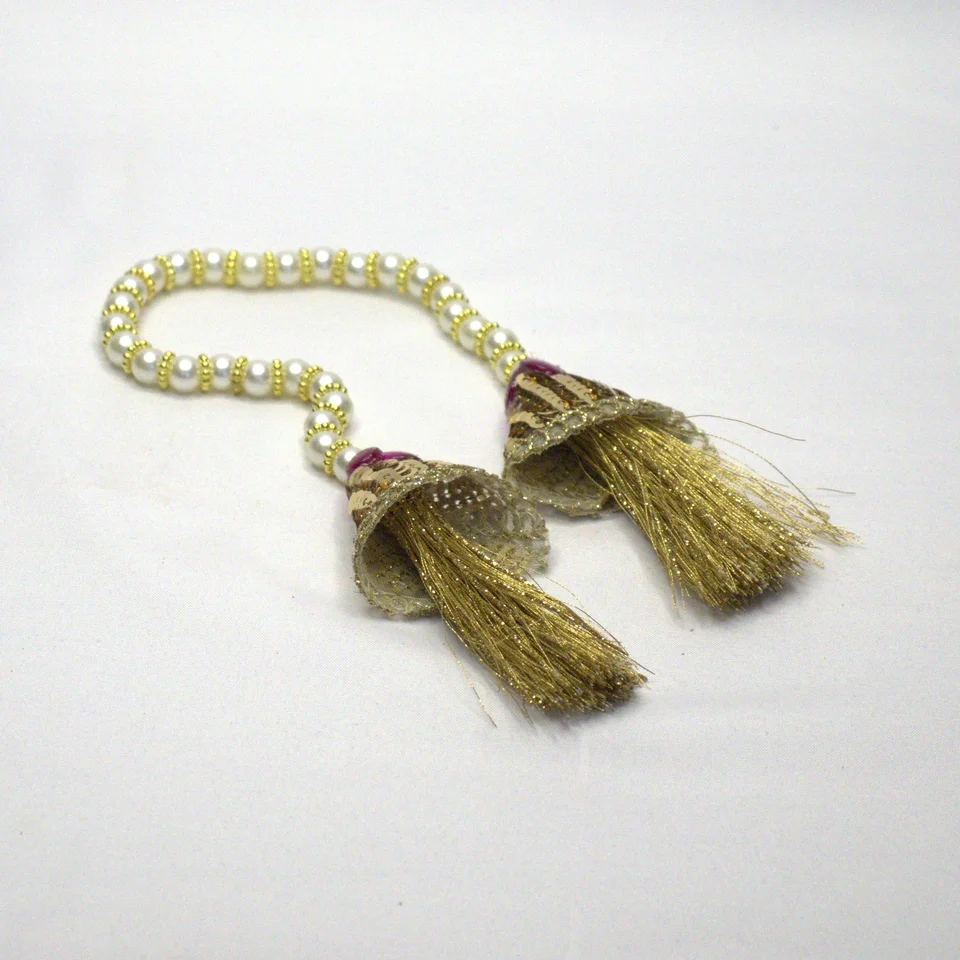 Pearl patka with matching gold lace and golden tassels completes the coordinated shringar set.