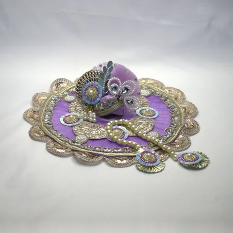 The coordinating mukut (crown) continues the lavender theme with matching sequin detailing, creating a cohesive look when placed atop the idol. Its design complements the dress while giving Thakurji a regal appearance befitting the deity.