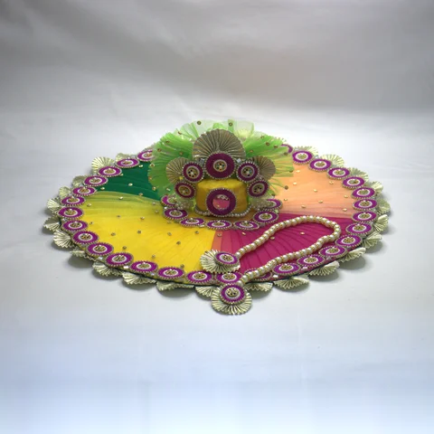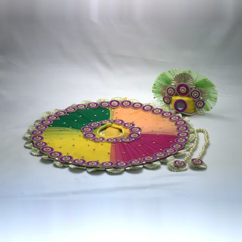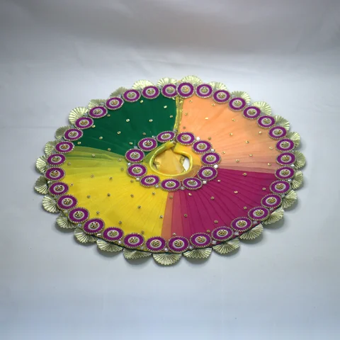 A complete shringar ensemble for your Laddu Gopal. The dress features multicolor net fabric that adds visual depth and richness to the festive look. The embellishments throughout the garment create a celebratory feel suited for special occasions.