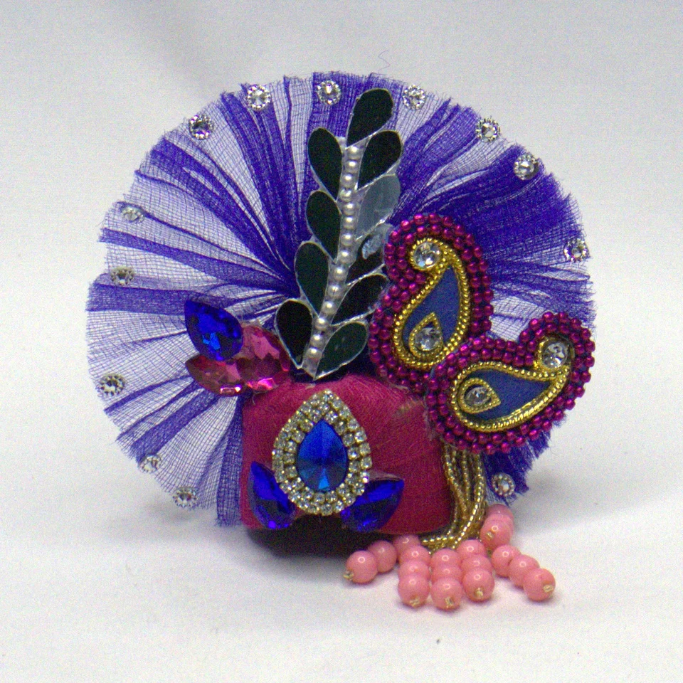 Multi-color net fabric poshak with dress, mukut and patka for complete shringar.