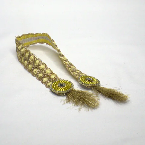 Coordinated patka sash with golden zari accents and decorative ball chain detailing.