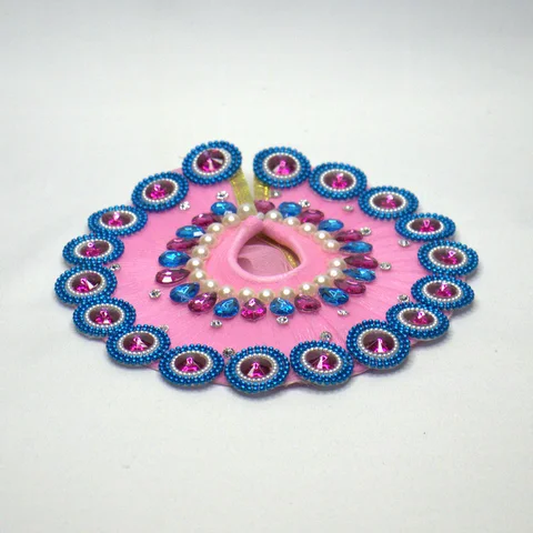 The soft pink palette with golden and pearl accents gives this set a warm, devotional quality perfect for Janmashtami celebrations or daily puja.
