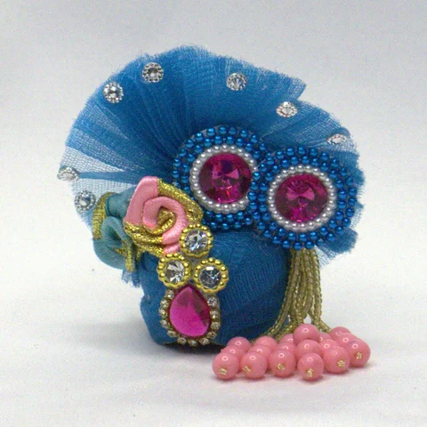 Matching mukut crown adorned with pearl latkan, feather and rhinestone embellishments.