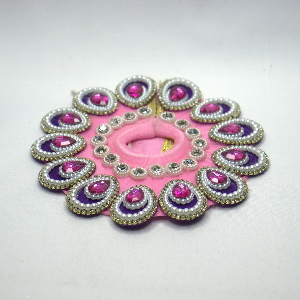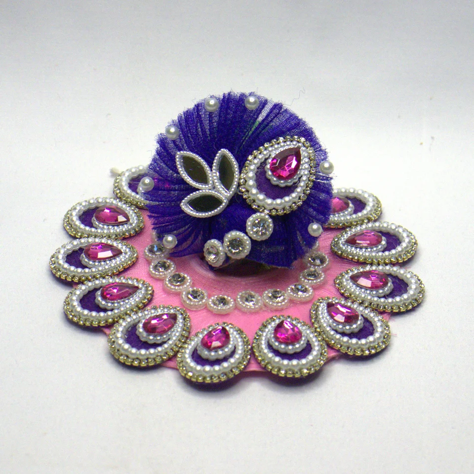 The included mukut crowns the Laddu Gopal idol with a coordinated pink finish, tying the shringar together in a cohesive look.