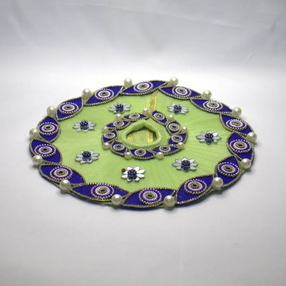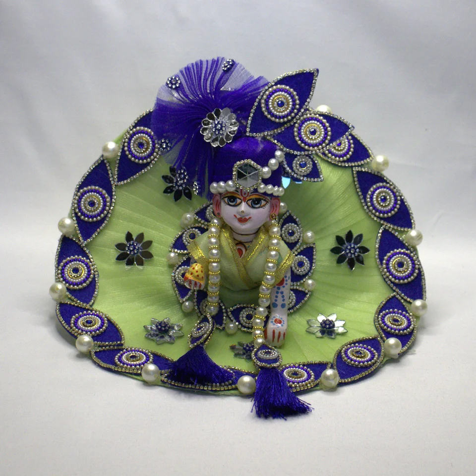Colour contrast between sea green and pearl white creates a serene yet festive appearance suitable for Janmashtami celebrations and daily adoration of Thakurji.