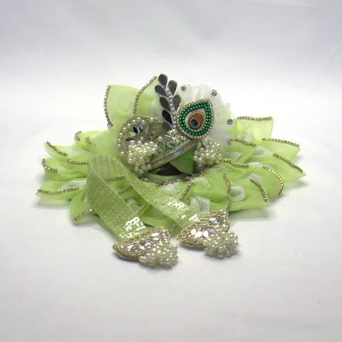 The Patka sash completes the set with sea green fabric that mirrors the dress and Mukut. Embroidered accents along its length add subtle detail, ensuring the sash reads as an intentional part of the ensemble rather than an afterthought. When draped across the idol's shoulder or waist, it grounds the look.