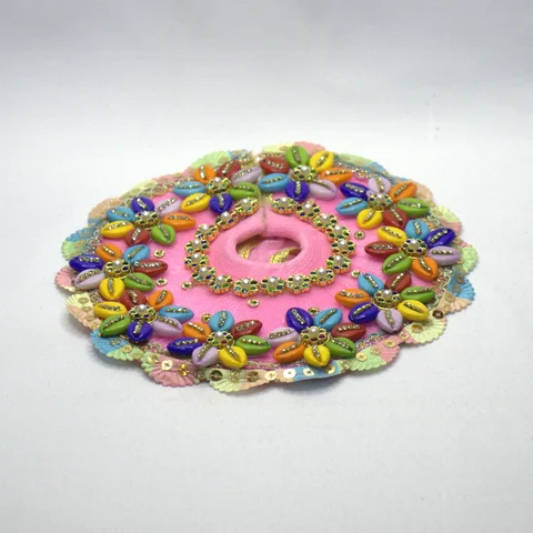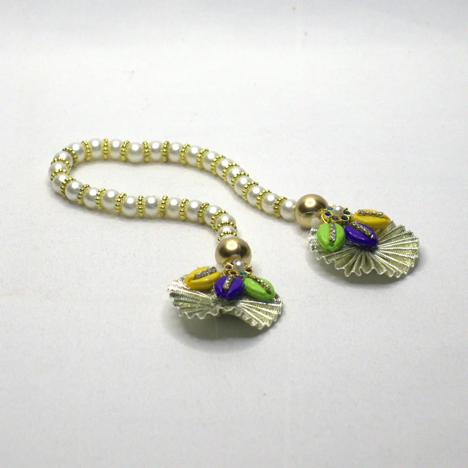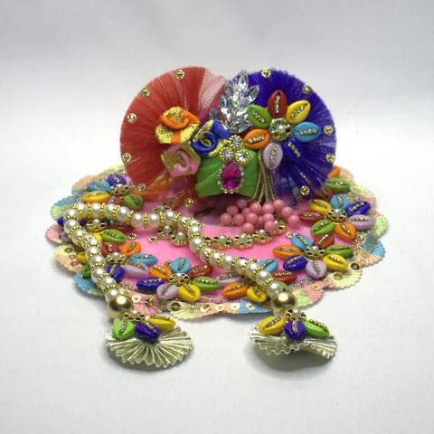 This three piece shringar set brings together pink, green, gold, and every rainbow colour in between. The variety of techniques and textures creates visual richness that makes Krishna idol look truly adorned.