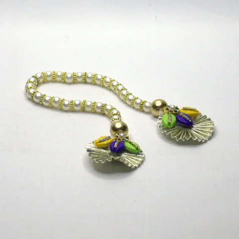Pearl patka adorned with shell butties and gota flowers for coordinated shringar look.